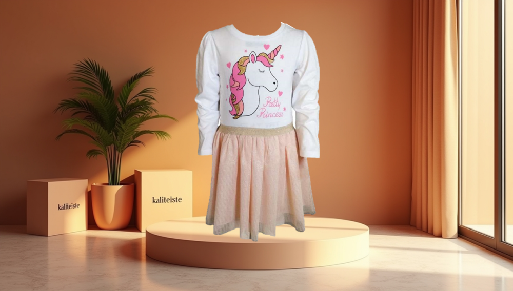 Kız Çocuk Tüllü Baskılı Elbise Pudra Beyaz - 1Kız Çocuk Tüllü Baskılı Elbise Pudra Beyaz - 2